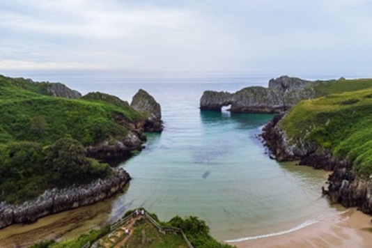 A short distance away, amid a unique environment, lies the San Román de Moroso Hermitage, in Bostronizo (within Arenas de Iguña), one of the best-preserved pre-Romanesque churches in northern Spain. Nestled among oaks and steeped in legend, its setting appears to have been made for quiet reflection. Visitors who make the journey here will discover not just a 10th-century architectural gem, but also a spiritual sanctuary embraced by the forest. At the heart of the Pasiego Valleys, Alto del Caracol presents one of Cantabria’s most breathtaking panoramic viewpoints. Here, the road winds upwards through meadows and traditional cabins, reaching a vantage point from which the landscape unfolds into an endless chain of valleys. The Pasiegos, heirs to a pastoral mountain lifestyle, perpetuate a way of life that embodies the region’s most authentic identity. Meanwhile, the coastline has plenty of secrets to share too. On the western coast, Berellín Beach, near Prellezo (in Val de San Vicente), lies tucked away among cliffs and rock formations that reveal a natural turquoise lagoon at low tide. Further east, Antuerta Beach, near Ajo (in Bareyo), retains its wild, untouched charm-with no facilities or crowds-while Oyambre combines dunes, meadows, and open sea within a serenely beautiful protected area. Berellín Beach, located on the western coast, is renowned for its stunning natural beauty and striking karst formations.